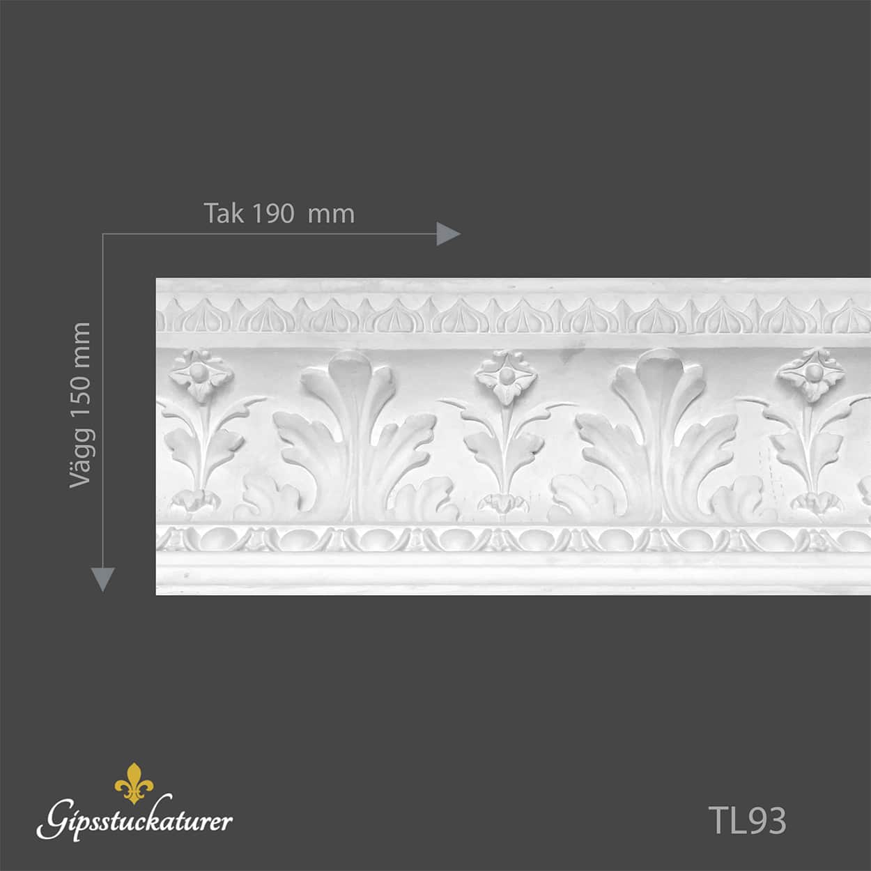 En dekorativ taklist TL93 för montering mellan vägg och tak. Svensktillverkad i omålad fransk gips och förstärkt med en inre struktur av glasfiber.